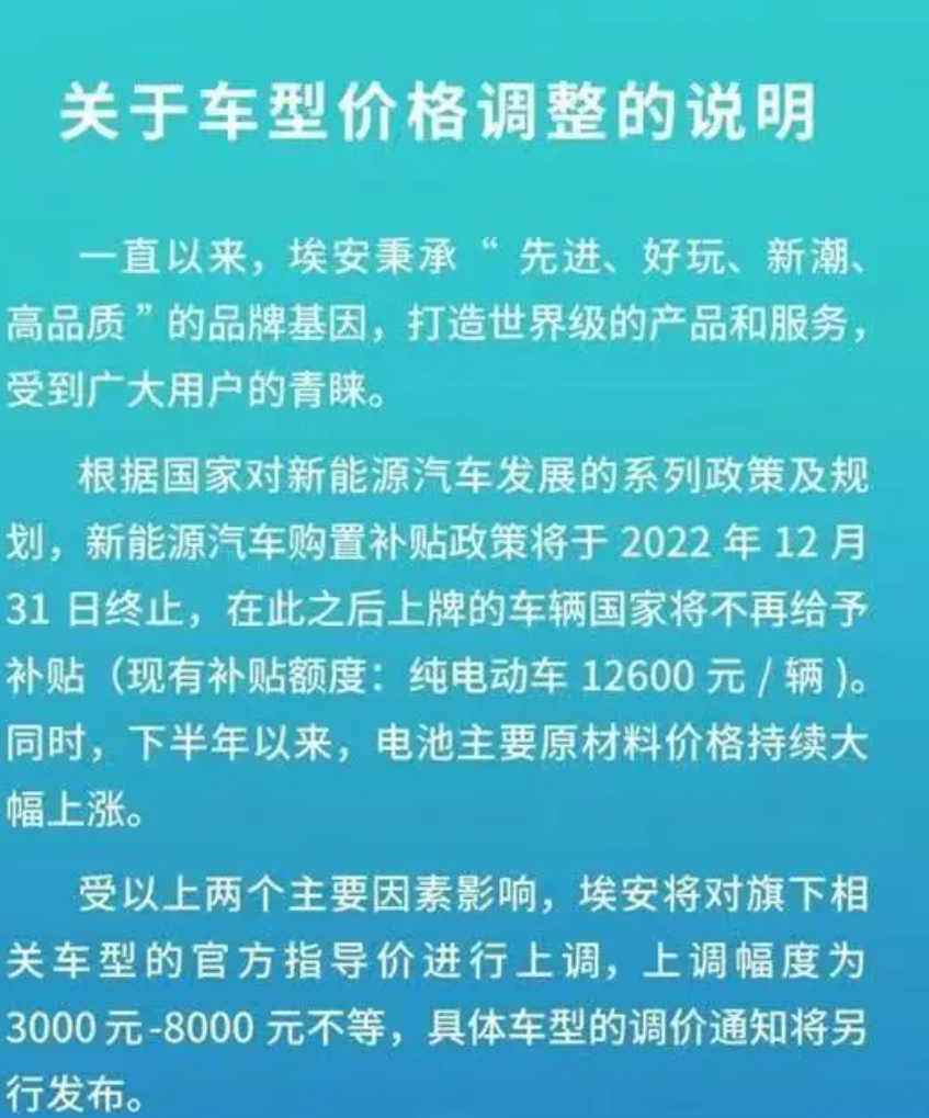 按照目前的政策,新能源汽车购置补贴政策将于2022年12月31日终止,但目前已经有越来越多的车企公布了自家品牌新能源车型的调价说明。