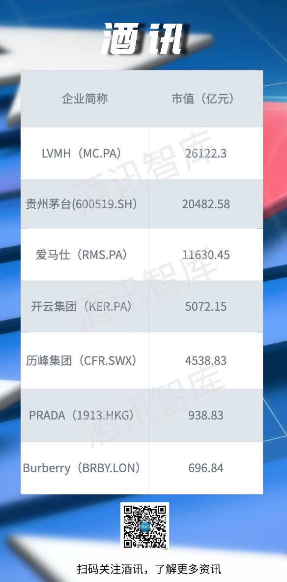 尽管随后经历了一年多的调整,贵州茅台市值依然在众多奢侈品品牌中位居前列。截至到12月1日,贵州茅台总市值约为2.05万亿元,同等营收规模的历峰集团(971.56亿元年营收)市值约为4538.83亿元,约为贵州茅台的五分之一。“老对手”LVMH,在经过一系列并购“强身健体”后,规模已达4747.99亿元,但与贵州茅台的市值差距仅为5640亿元。
