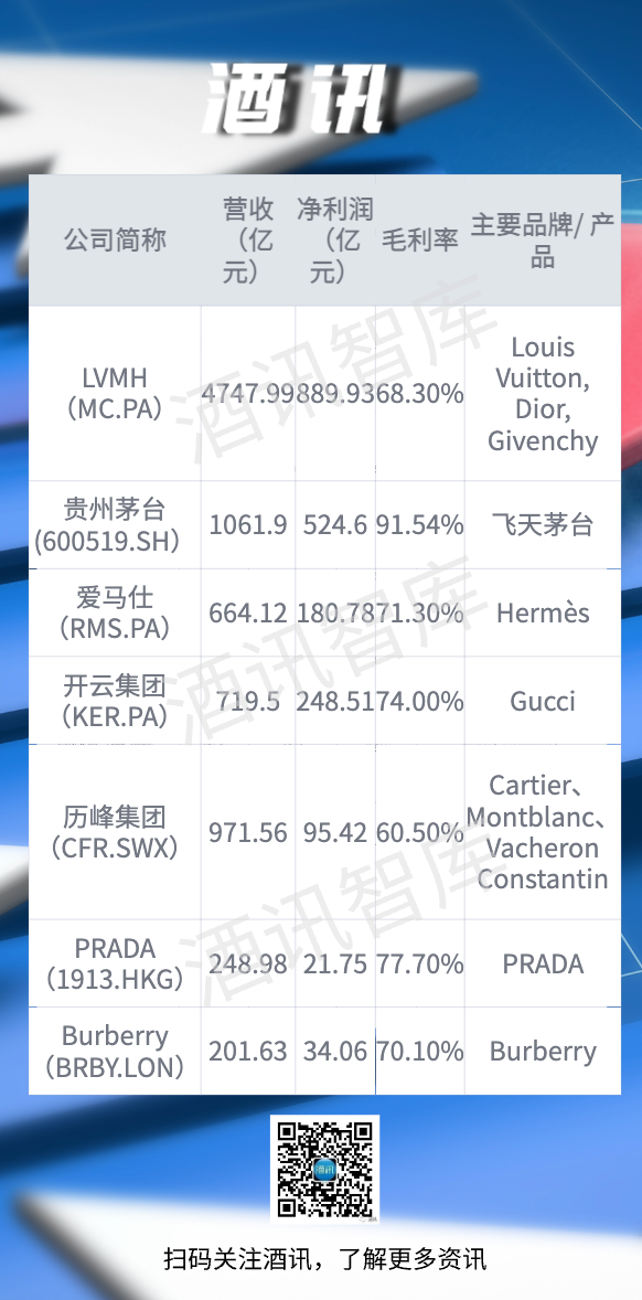 而在盈利能力方面,作为“暴利”的白酒行业的老大哥,贵州茅台在市场上几乎没有对手。对比来看,2021年贵州茅台的毛利率为91.54%,一众知名奢侈品品牌的毛利率基本保持在70%左右,赚钱能力高下立见。