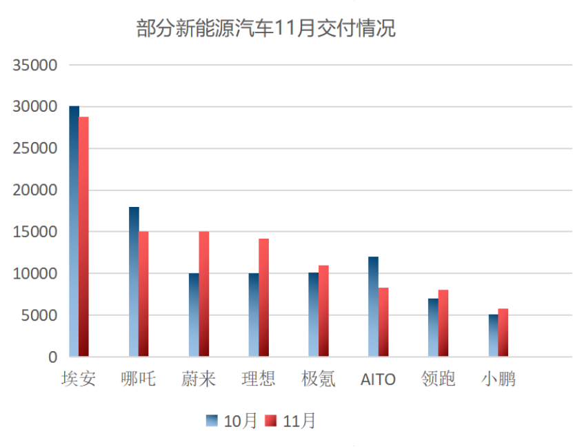 新能源汽车的销量成绩在10月本就有所下滑,部分车企11月持续下滑,如埃安、问界AITO。但极氪、零跑和小鹏有所回升,蔚来与理想的交付量则让人惊喜。