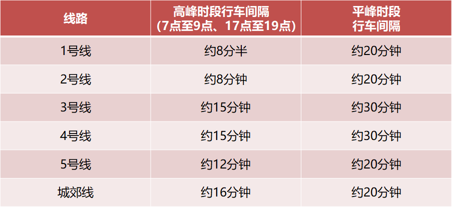线路行车间隔如下表:
