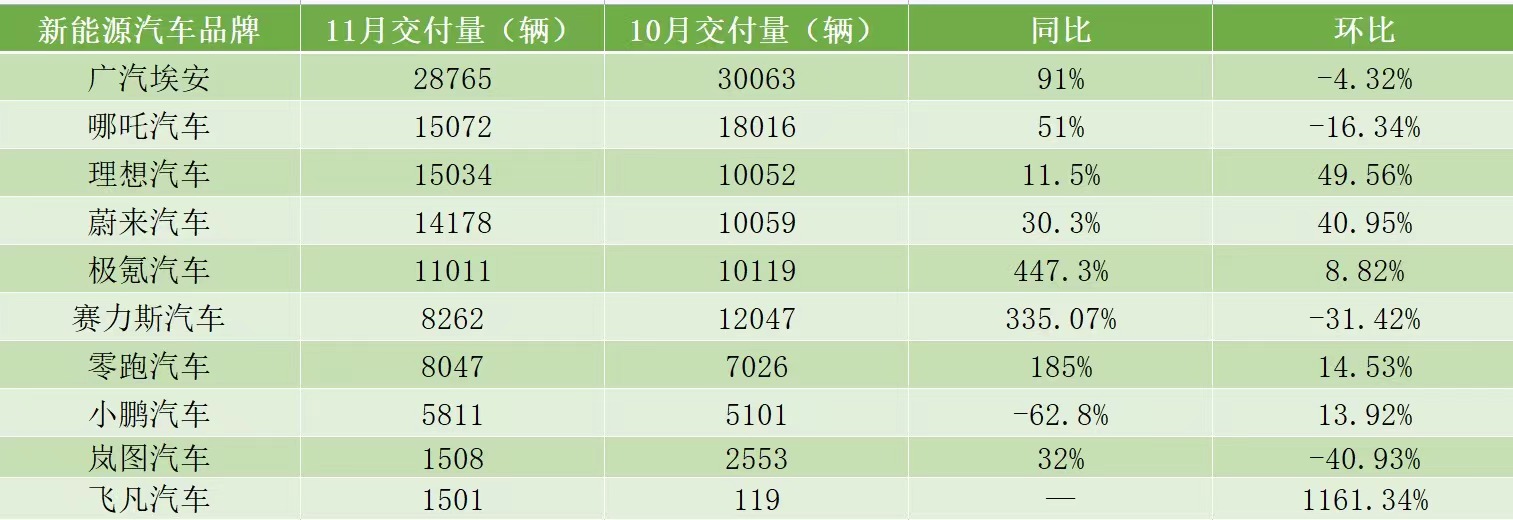 12月1日,多家造车新势力先后公布11月销量数据。随着“银十”销售旺季热度淡去,新势力品牌销量也受汽车零售市场逐步冷却影响出现整体下滑。连续稳居榜首的埃安、哪吒等品牌均出现4位数以上环比销量下滑。上月市场表现低迷的理想与蔚来则逆势增长,双双创下单月交付量新高。