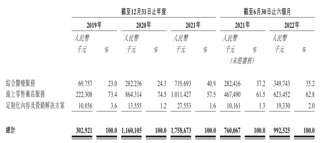 从收入结构来看,公司收入主要来自线上零售药店服务和综合医疗服务。2022年上半年,线上零售药店收入6.23亿,收入占比63%;综合医疗服务收入3.50亿,收入占比35%。