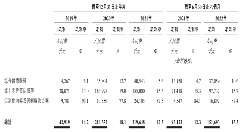 “卖药”业务虽然贡献了超60%的收入,但该业务毛利率偏低。报告期内,舟云康的线上零售药店服务毛利率分别为13.0%、19.0%、15.3%、15.7%。