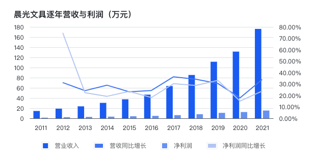 2020年,疫情爆发,学校停课,门店停业,晨光最为倚重的线下销售场景遭受重击,导致当年营收增速和净利润增速跌落至17.92%及15.08%,为上市以来最低值。