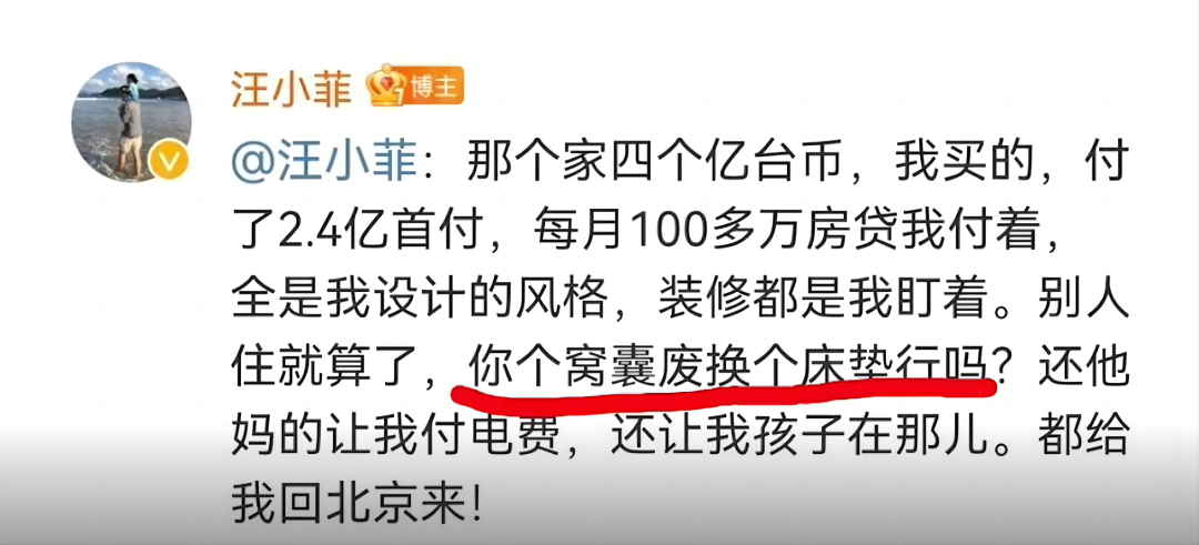 汪小菲一句怒气冲冲的“你个窝囊废换个床垫行吗”,马上就让微博沸腾了。
