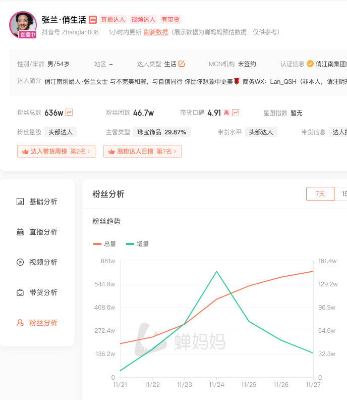我看了下数据,张兰直播间一周吸粉400万,并直接飙升到抖音达人带货榜第2名。