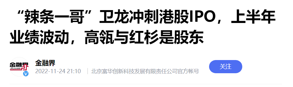 就在张兰卖辣条的这几天,卫龙正在冲刺港股上市……张兰这个时候宣传“辣条一哥”卫龙,也等于是互相背书了。
