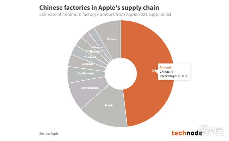 放眼全球苹果工厂,根据市场研究机构Technode整理数据,位于中国大陆的工厂数量接近300座,占比达到48%。