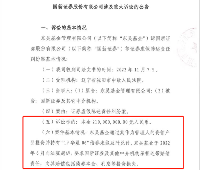 因“19华晨06”债券违约,国新证券作为主承销商之一(另一家主承销为申万宏源),2022年6月被东吴基金起诉,要求被告国新证券及其他中介机构承担连带赔偿债券本金、利息等投资损失,诉讼标的额为2.1亿元。