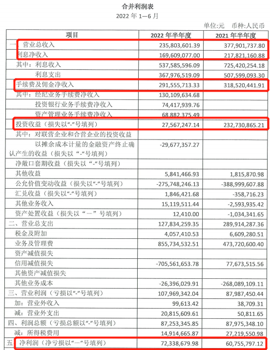 2022年上半年,其营业收入为2.36亿元,同比下降37.56%,主要原因在于利息净收入(1.7亿元)、手续费及佣金净收入(2.92亿元)、投资收益(0.28亿元)下降所致,其中投资收益下降幅度高达87.9%。上半年净利润表现较好,达7233.9万元,同比增长19.06%。