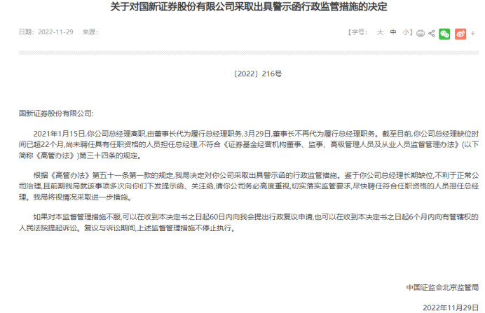 11月29日,国新证券总经理缺位长达22个月后,北京证监局发布了《关于对国新证券出具警示函行政监管措施的决定》,并表示“务必高度重视”。在此之前,北京证监局已对此问题曾向国新证券下发提示函、关注函。