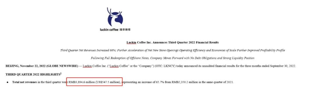这次财报显示,2022年第三季度,瑞幸净收入总额为人民币38.946亿元(5.475亿美元),较2021年同期的人民币23.502亿元增长65.7%。美国会计准则(GAAP)下营业利润为5.853亿元,营业利润率达15.0%,首次突破双位数。而2021年同期的GAAP营业亏损为人民币670万元。