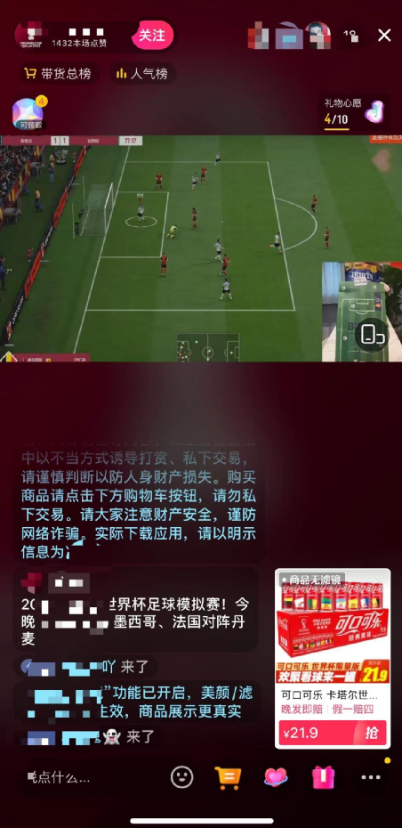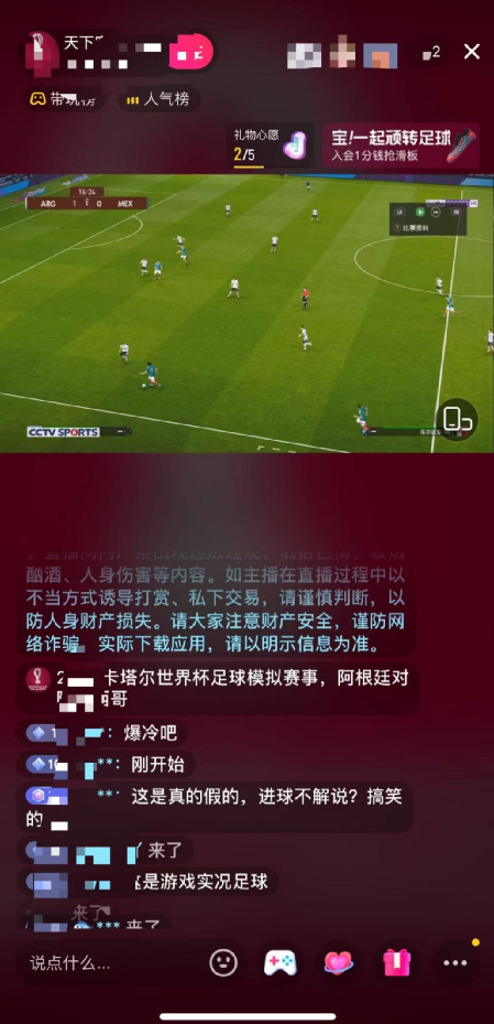 不止女足,还有更“逼真”的世界杯预测赛,从场地到球员甚至到球衣都能完美复刻,上万人涌入直播间为自己喜欢的球队加油,每看到赛事的“高潮”,还有不少人为主播点赞送礼物。