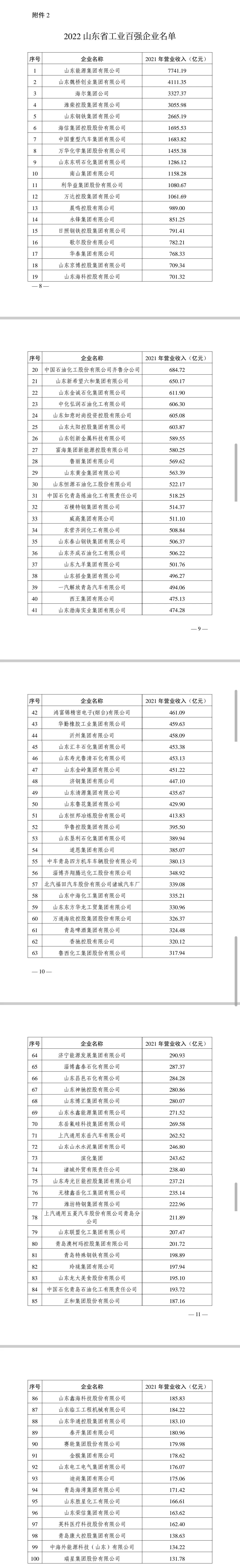 2022山东省工业百强企业名单如下: