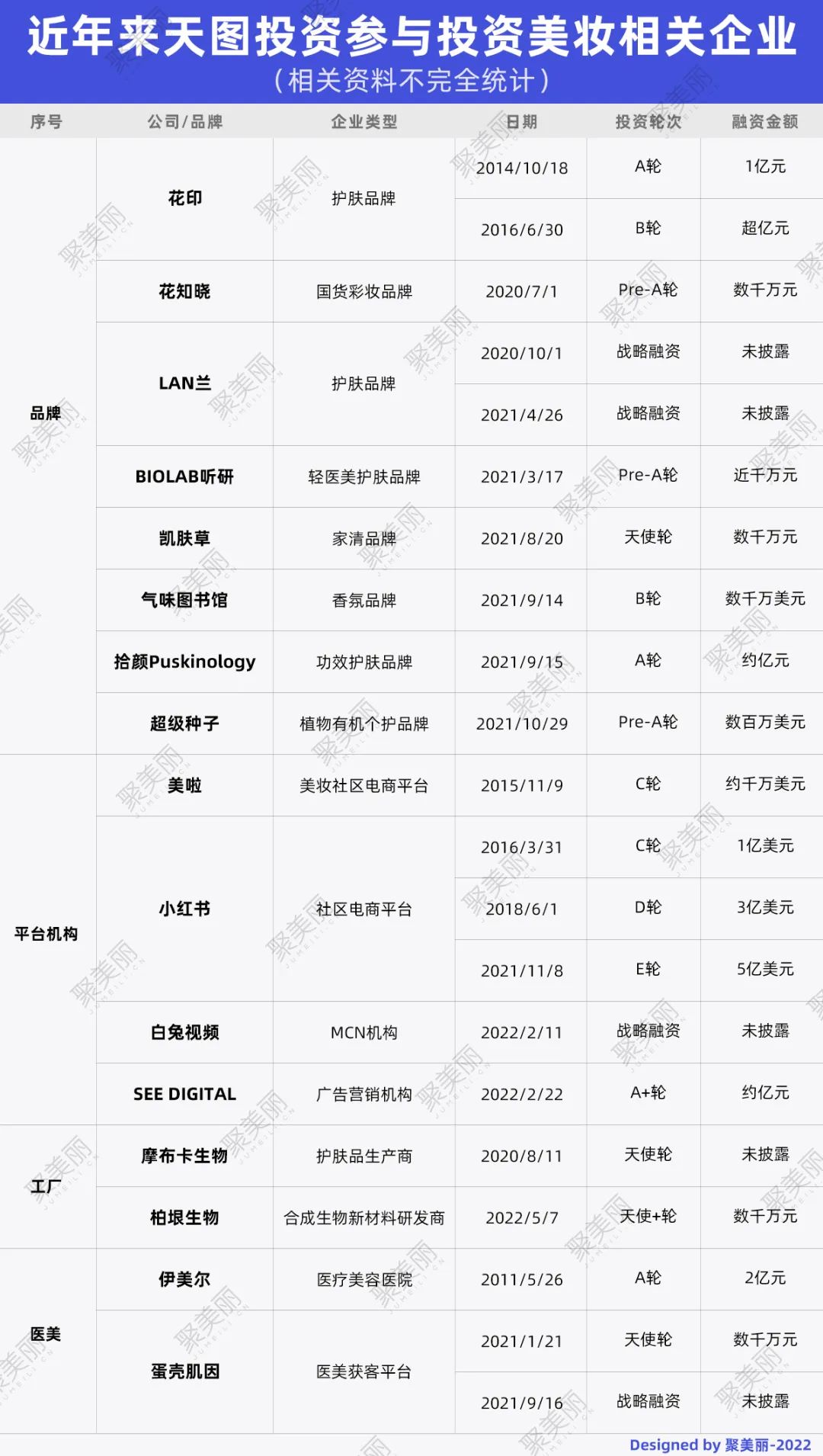 据聚美丽不完全统计,天图在美妆相关领域的投资项目共计16个,覆盖面不仅包括品牌,还包括生产商、服务商、平台等。