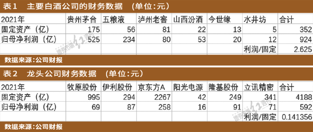 笔者详细翻阅茅台近年来的历次扩产和技改项目文件,发现单体项目投资额均在几十亿的级别,仅靠公司一两个月的净利润便可覆盖,显然并不构成较大的资金压力。或者我们可以换一个更直观的计算方式:2021年年报,茅台固定资产175亿,归母净利润525亿,二者的比值刚好是1:3(这在其他行业看来是个惊人的比例,见表1和表2),也就是说公司每1块钱的新增固定资产投入,大概能换来3块钱的新增税后利润。
