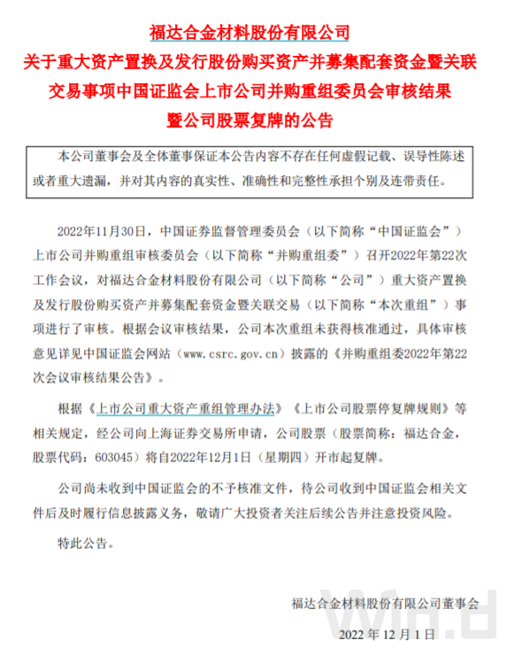 11月30日,福达合金(603045.SH)发布公告,公司筹划的逾155亿元重大资产重组事项,证监会并购重组委审核了重组方案,否决了本次重组。