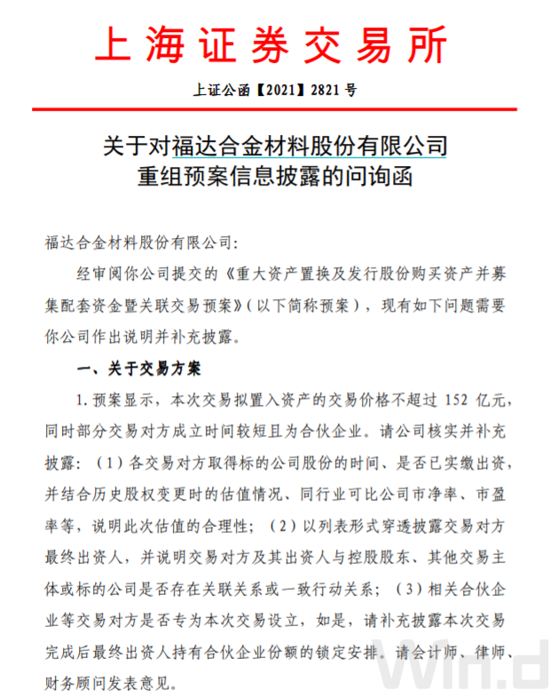 然而,重组预案公布后,随即引发监管关注。10月26日,上交所发函要求福达合金就重组标的营收下滑、大客户以及股东背景分别予以披露。