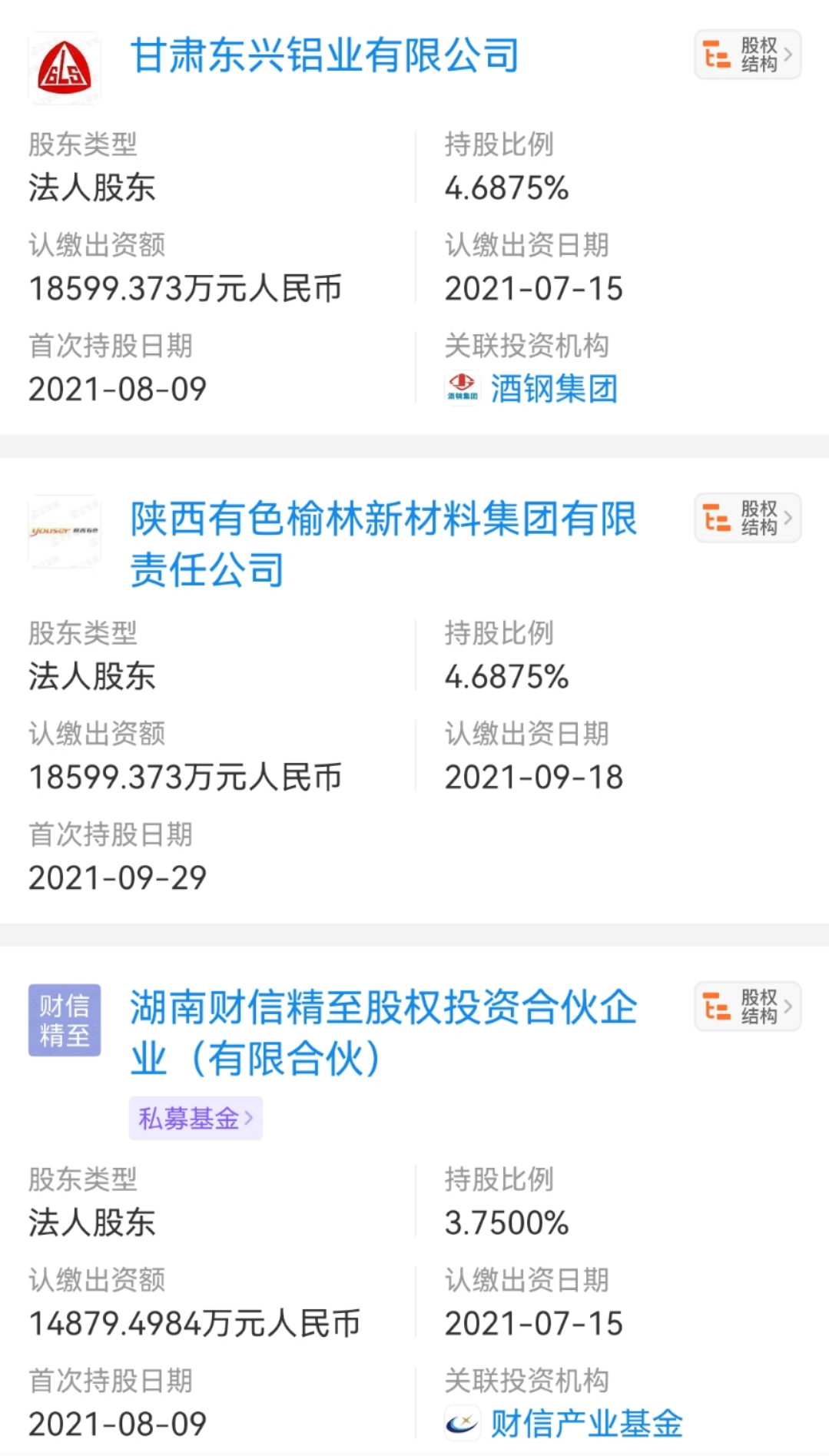 另外,厦门象源入股后持有3.13%股权,该公司是厦门象屿(600057.SH)的全资子公司;神火煤电入股后持有1.88%股权,该公司是神火股份(000933.SZ)的全资孙公司。