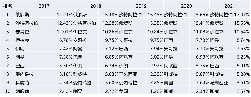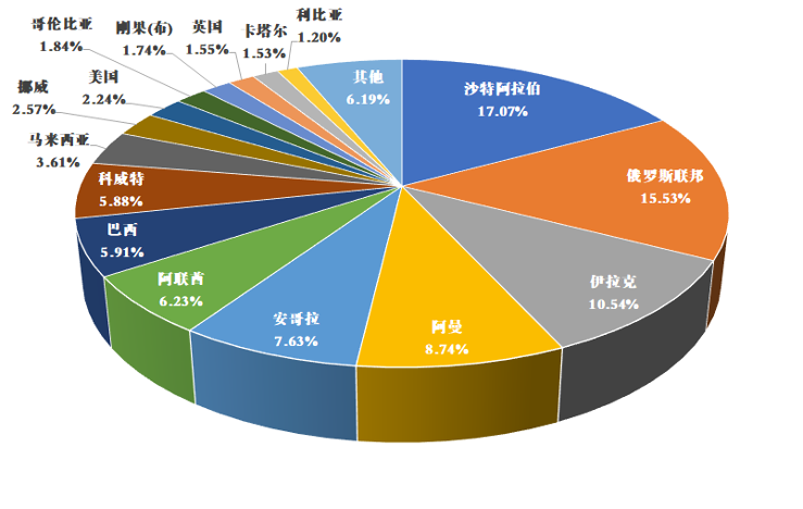 除俄罗斯(欧洲)、安哥拉(非洲)和巴西(南美洲)外,中国的石油进口量前十国家大多来源于中东地区,进口量占比约50%。