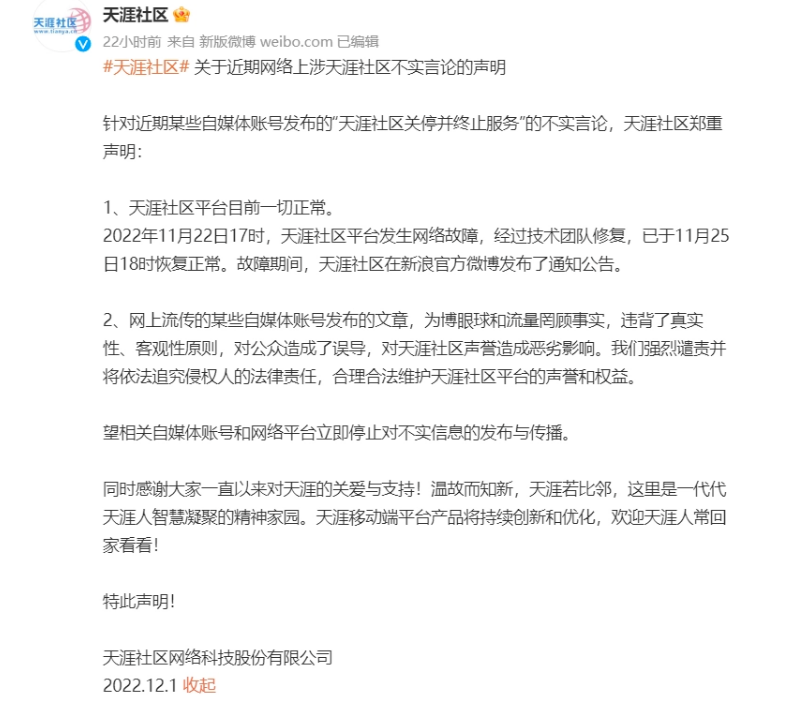 但反转的是,12月2日,天涯社区官方发布声明否认了这一传闻,表示天涯社区平台目前一切正常。当时的板块冻结是由于发生网络故障,经过技术团队修复后,已于 11 月 25 日 18 时恢复正常。故障期间,天涯社区还在新浪官方微博发布了通知公告。