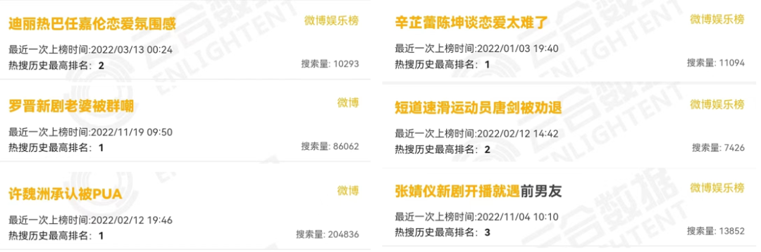 可惜好景不长,#吴淼强吻菜丝#的词条被粉丝怒骂炒cp毫无底线;因艺人方投诉,#李透明霸气和女士分手#热搜被迫下架;因为网友对热搜词条的误解伤害到家人,《天上银河》的男主角发博怒斥剧方,不再配合任何宣传……