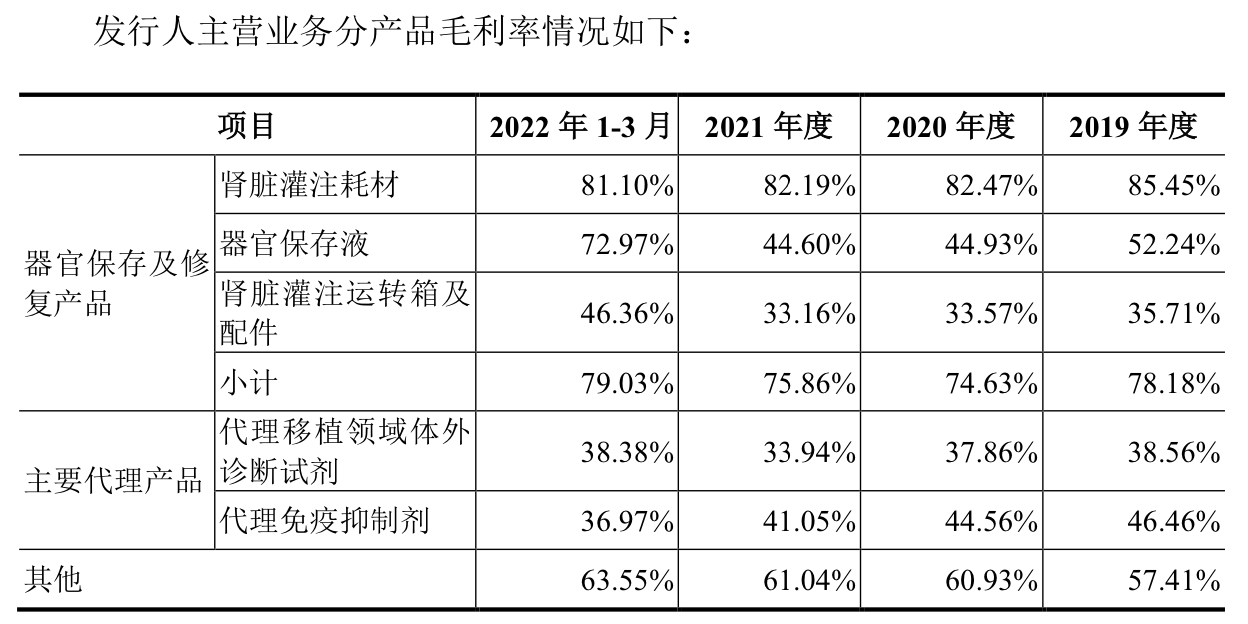 公司的综合毛利率分别为74.71%、72.25%、72.59%及75.14%,变化倒不大。分产品看,肾脏灌注耗材原材料成本稍有上升,导致毛利率略有下降。另外在报告期内为增强产品市场竞争力,公司对各地区器官保存液销售单价进行下调,导致平均销售单价下降,因此,器官保存液于2020年、2021年的毛利率随销售单价降低而下降。2022年1-3月,受原材料短缺影响,器官保存液供应不足,导致当期销售总量较小,且大部分位于定价较高的地区,因此器官保存液毛利率呈现上升趋势。至于代理的免疫抑制剂,2021年7月之前,健耕医药代理的免疫抑制剂产品采购自海正药业(600267.SH)及其控股子公司。自2021年8月开始,吗替麦考酚酯胶囊的供应商转为浙江长典医药有限公司,由于公司免疫抑制剂的销售主要面向不需要履行“两票制”的药房等类型的客户,销售量较小,且市场竞争较为激烈,价格整体呈下降趋势,因此毛利率逐年下降。