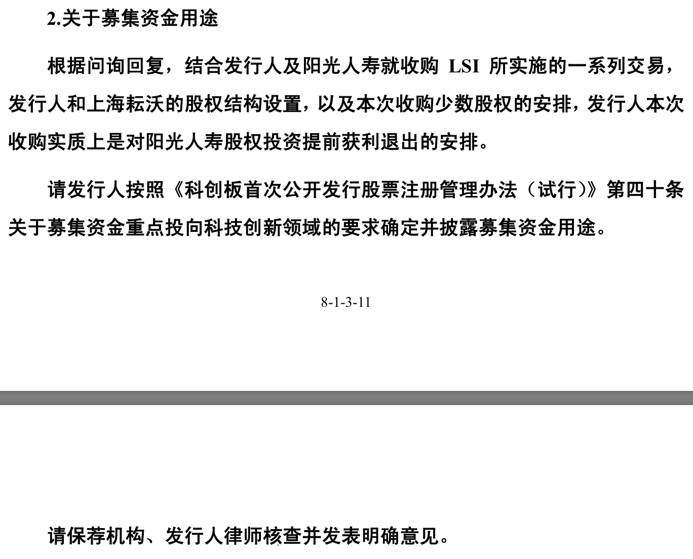 根据2020年12月4日的问询及回复,上海耘沃系公司设立用于整体收购海外主体LSI的投资平台,阳光人寿则系公司为完成收购引入的财务投资者。在2020年5月11日最开始的申报稿中显示,健耕医药持有上海耘沃68.67%,阳光人寿持有上海耘沃31.33%。上海耘沃通过实际控制的GLS Holdings来全资控股LSI。根据此前上海耘沃的公司章程,阳光人寿曾在董事会层面就部分事项享有一票否决权。当时也确有一名阳光人寿工作人员担任董事。这也导致在第一版说明书中,募投项目里有一个“收购上海耘沃31.33%的股权”这一项目。该募投项目当时也被诟病过。