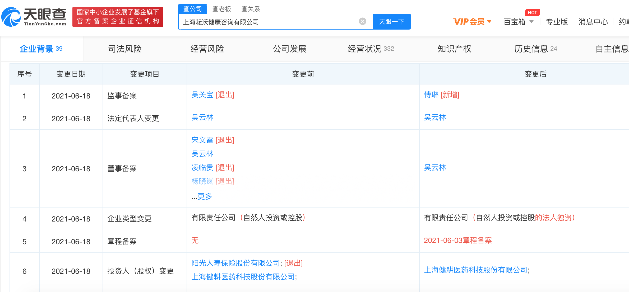 天眼查显示,阳光人寿是在2021年6月18日退出的。