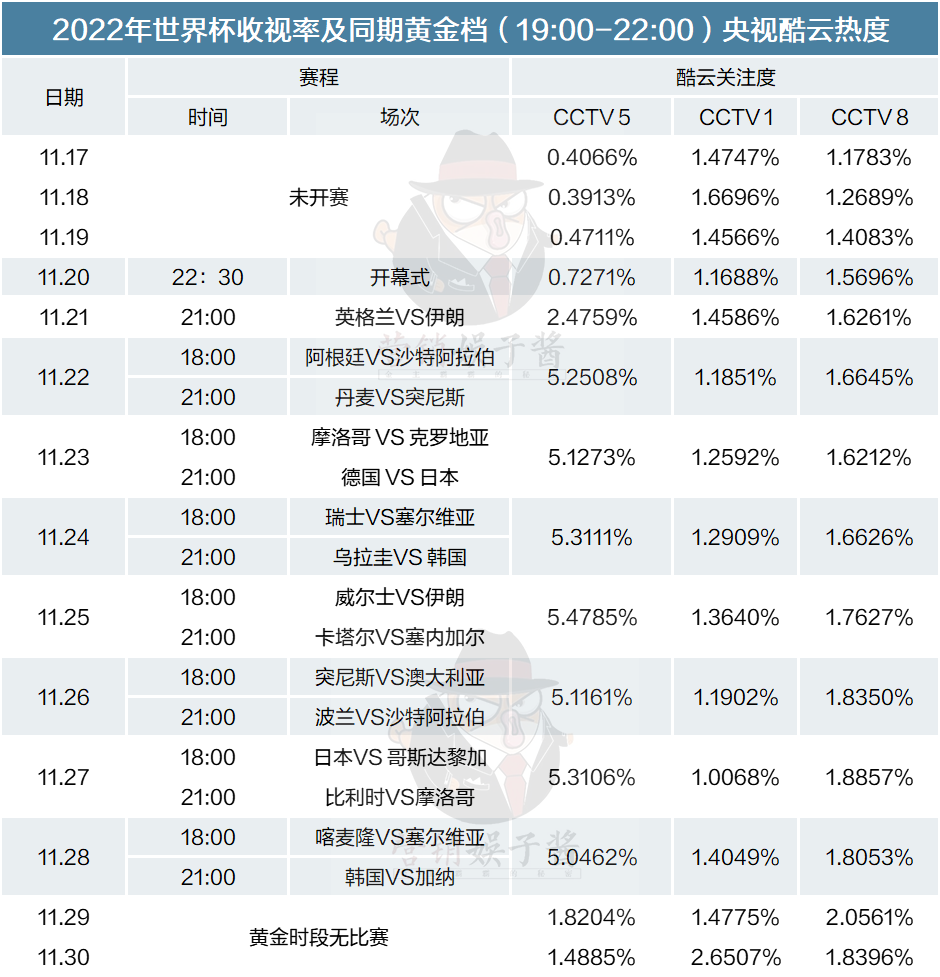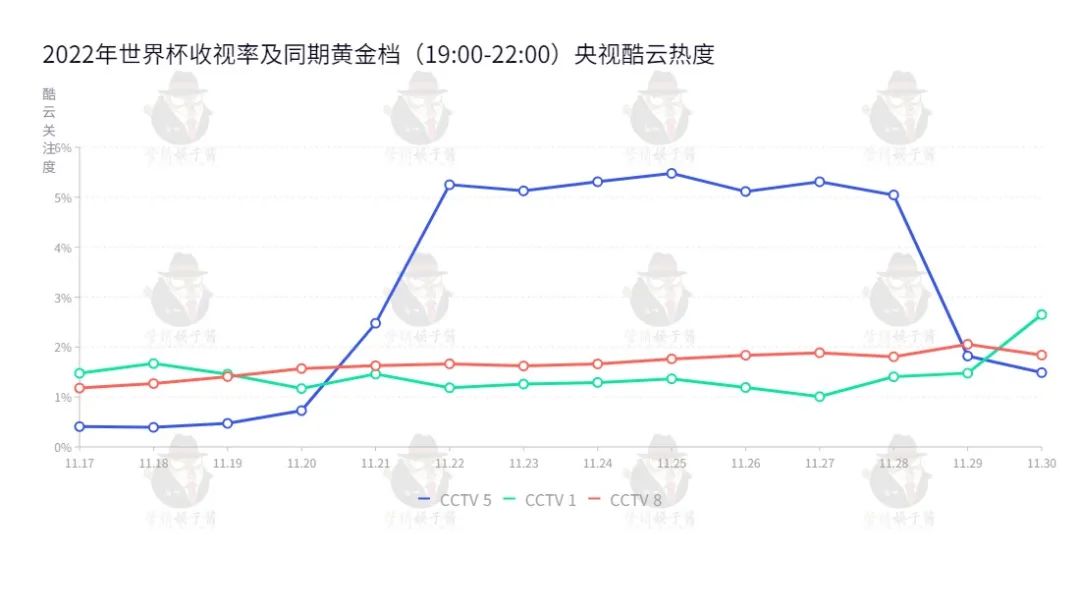 根据酷云数据,截至11月30日,中央广播电视总台CCTV5频道转播的世界杯小组赛赛事,有13场直播关注度超过3%,其中有5场直播关注度超过5%。