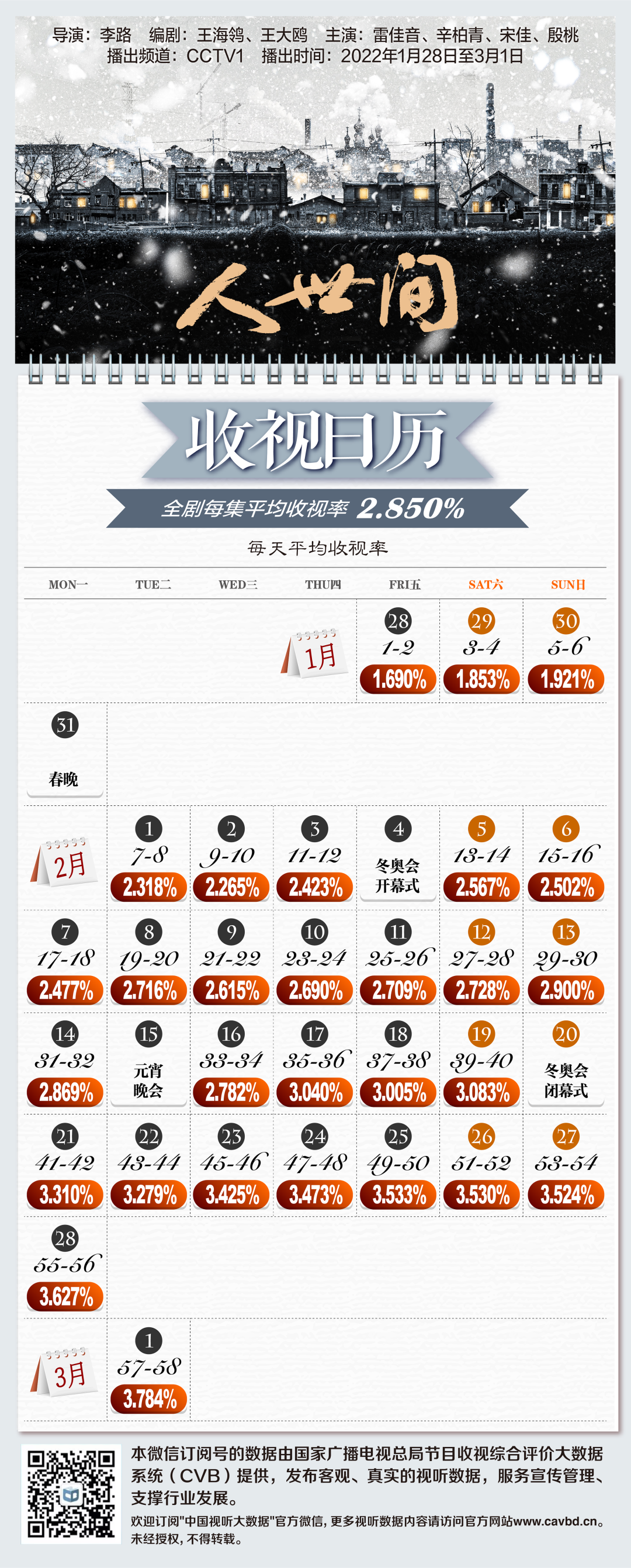 今年撞档冬奥会的《人世间》是备受期待的年代剧之一,汇集了雷佳音、辛柏青、殷桃等众多实力派演员。虽然网络讨论空间受到了挤压,但其收视率数据依旧可观,屡屡创下收视新高,收官当晚在爱奇艺站内热度值突破10000,成为2022年第一个热度值破万的电视剧。