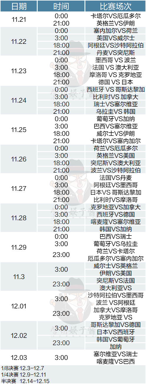 今年的世界杯赛开幕式时间为北京时间11月20日22:30,赛程从11月21日开始,到12月18日结束。而11月21日到28日,每日共有三个场次的比赛,时间基本为0点、3点、18点、21点四个时间段(除首日)。