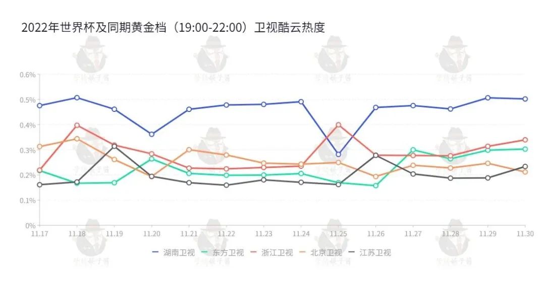 与央视相比,五大地方卫视的数据情况更为复杂。世界杯期间,湖南卫视与东方卫视的关注度变化不大,且略有微升趋势,而浙江卫视、北京卫视、江苏卫视的数据略有下降。