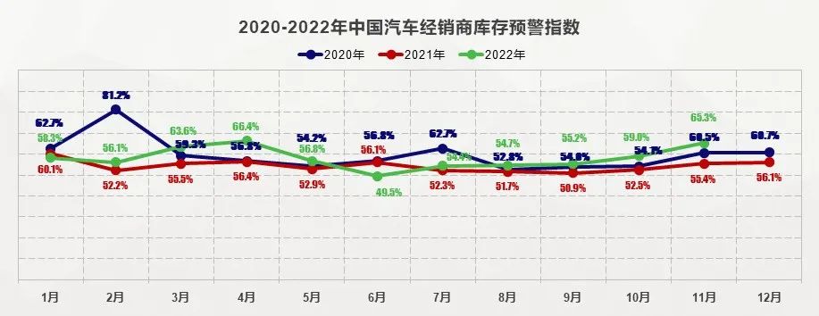 据中国汽车流通协会数据显示,目前有超过73%的经销商无法完成销量任务,其中61.1%任务完成率不足80%。2022年11月,中国汽车经销商库存预警指数为65.3%,同比上升9.9%,环比上升6.3%,库存预警指数已位于荣枯线之上,这意味着经销商正面临着更大的经营压力与风险。
