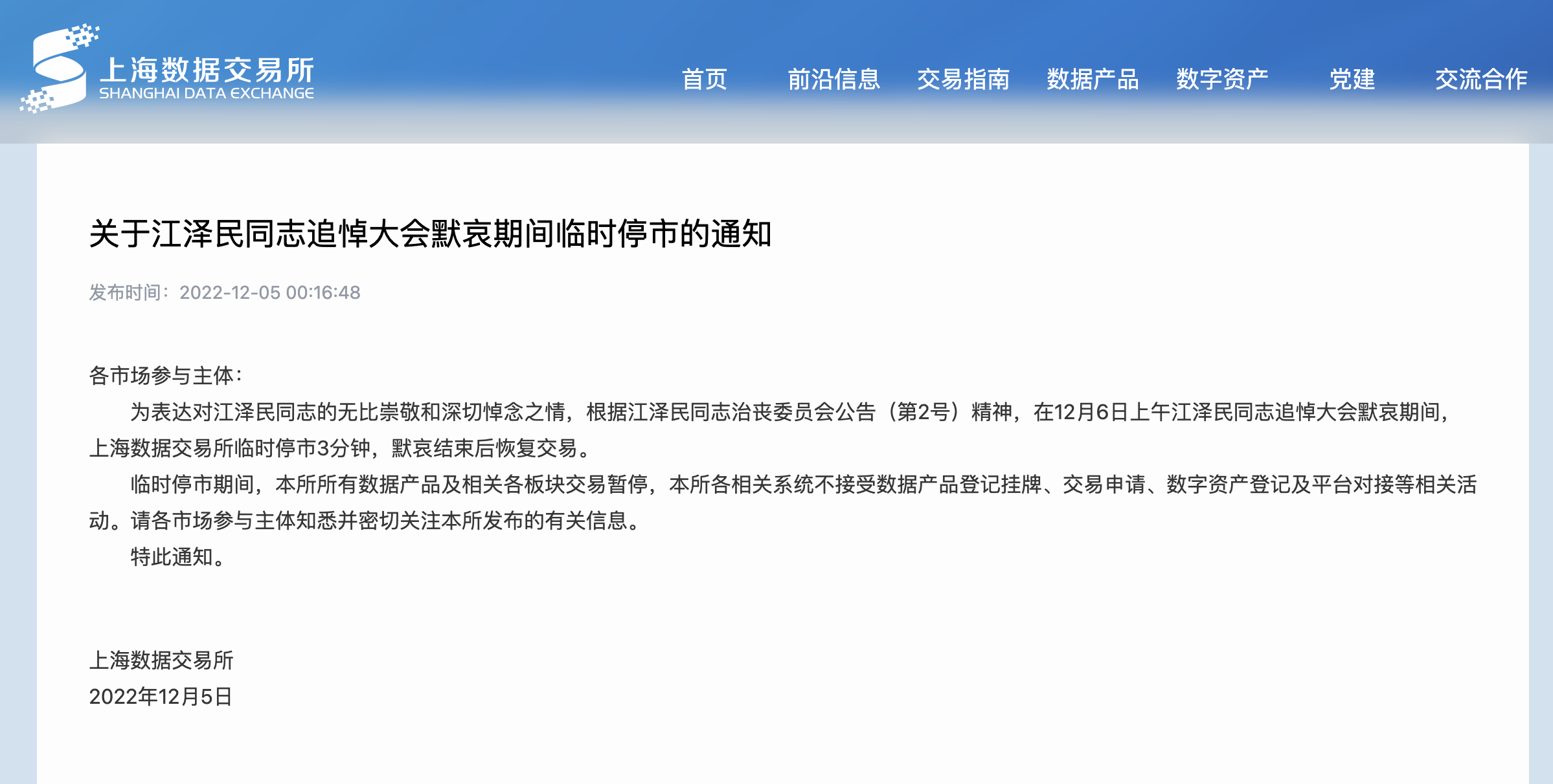 12月5日,上海数据交易所官网发布通知:为表达对江泽民同志的无比崇敬和深切悼念之情,根据江泽民同志治丧委员会公告(第2号)精神,在12月6日上午江泽民同志追悼大会默哀期间,上海数据交易所临时停市3分钟,默哀结束后恢复交易。