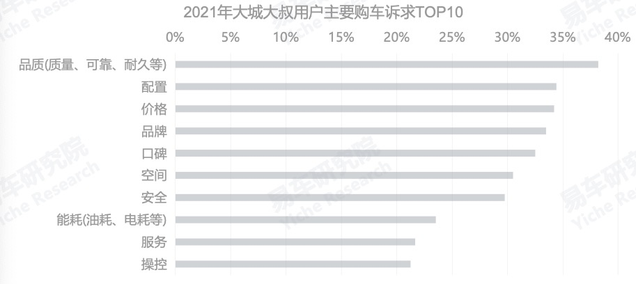易车研究院在2022年6月份的报告里,曾对一线、准一线和二线城市的35-54岁男性车主做过调查,发现这些用户在购车时,品牌已经不是主要的诉求。品质、配置排在了前面。