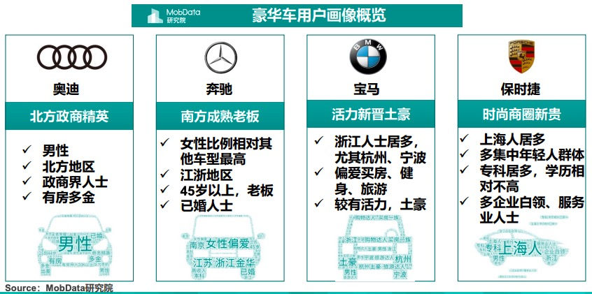2022年,易车研究院的一份报告里提到,山西煤老板、温州暴发户等大叔群体,是奥迪、奔驰、宝马等核心用户,近四五年,女性用户占比也在越来越高。上图MobData的一份报告,和易车研究院的结论基本一致,BBA车主里,除了政界人士,主流车主为南方成熟老板、活力新晋“土豪”。