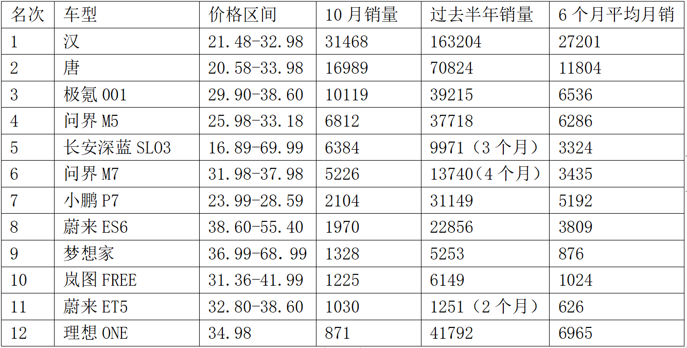 根据上图,可以看出,在中高端车型,国产车的销量也非常可观。比亚迪汉的六个月销量达到16.32万,陆玖商业评论经统计,特斯拉最畅销的Model Y销量为15.79万,Model3仅为6.77万台。如果看10月份的数据,比亚迪汉、唐排在一二名,Model Y排在第三,而极氪001、问界M5排在四五位,国产汽车已经越来越被人们所接受。