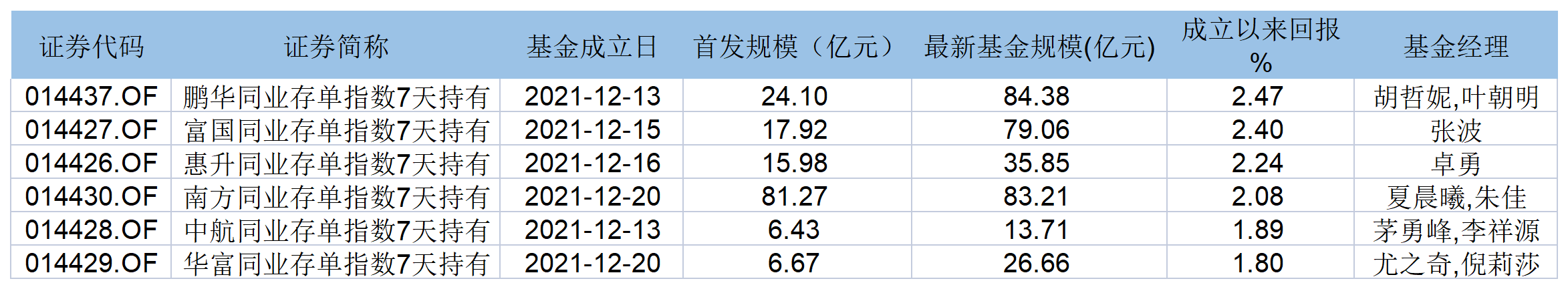从规模来看,鹏华、富国两只同业存单指数基金的规模已经飙升至84.38亿元、79.06亿元。而惠升、中航、华富三只同业存单指数基金的最新规模相比成立之初也已经翻倍。由于规模限制的原因,首发规模最大的南方同业存单指数基金,也一直维持在80亿元左右的规模上限。