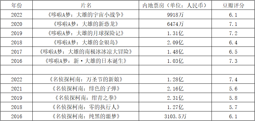 对于重复性地观赏“行活”,不论是路人观众还是粉丝都势必会感到一定程度的审美疲劳,这一点在中国市场尤为明显。《哆啦A梦》剧场版自2016年到现在,除世界观与画风有较大差异的《伴我同行》系列之外,每年在内地的票房大多数都在1亿-2亿之间徘徊,而《名侦探柯南》则是大多数在1亿-2.5亿之间徘徊。