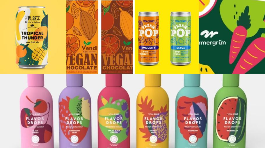 2023年最打动消费者的食品包装设计趋势之一是采用鲜明有趣的方式为消费者讲述食品的配料,这回应了人们对于食品透明度的关注。这种方式不仅可以更好地向消费者普及食品成分知识,还可以区分产品的风味。这一趋势中的视觉效果倾向于卡通化和年轻化,以此来唤起消费者的童年回忆并为产品赋予健康的能量。插图元素往往依靠新鲜、多汁的流行色彩和不那么精致的艺术风格,如涂鸦,使包装上的产品更具吸引力和乐趣。