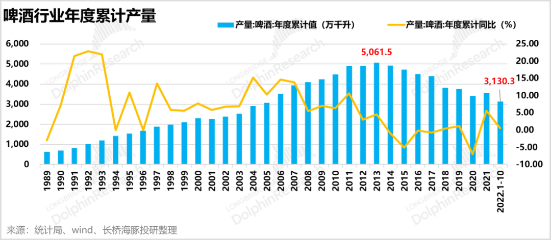 a.先看长期数据,下图中可以很明显地看到,从2013年开始,啤酒总产量逐年下滑,2018年开始下滑态势虽有所回稳且最近三年有疫情干扰,但整体仍在小幅缩量之中。