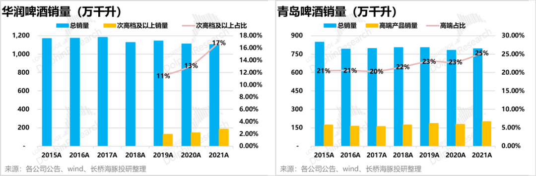 以两大国民品牌华润、青啤来看,高端化推进涨价量化落地到公司业绩的表现这两家公司的啤酒销量都已停滞,四五年来基本没有增量,但在最近三年高端销量占比都在明显提升当中。
