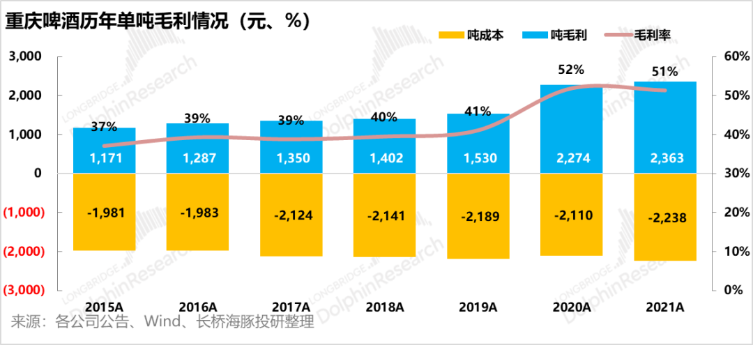 我们再纵向以单一公司的高端化过程的吨价、吨毛利的变化趋势来确认一下:重啤2020年嘉士伯资产注入之前两年,它的吨价不高,成本基本是在2100多一些,比较稳定,但嘉士伯资产注入之后,它在单吨成本基本未变的情况下,吨价的增长全部转化成了单吨利润,毛利率陡然拉到了50%以上。