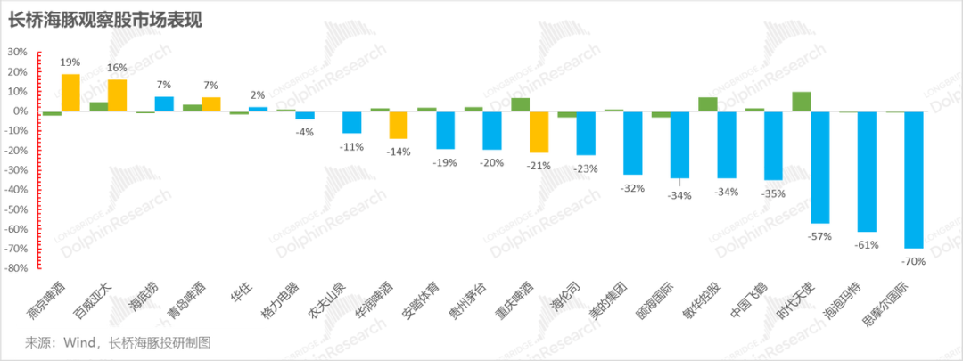 但这并不是说各大消费品类都是清一色的“卧倒状态”:在海豚君精选覆盖的15家泛消费公司当中,如果你消费主要放在了啤酒上,胜率显然是比较大的,譬如海豚君重点覆盖的青啤以及对比跟踪的燕京、百威亚太全年还都是难得的正收益。