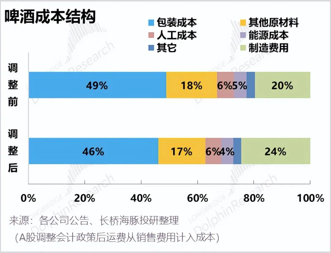 不同于价格竞争的以量取胜,啤酒这种成本以包材为主、而且相对高毛利的快销品,迈入高端化的吨价上涨时代,涨价就是其实就是利润释放,因为啤酒行业中,成本主要集中在包材(铝、玻璃、瓦楞纸等,占比接近50%),而高端、低端其实差距更多是在于口味,好不好喝,包装上是没有太大差距的。