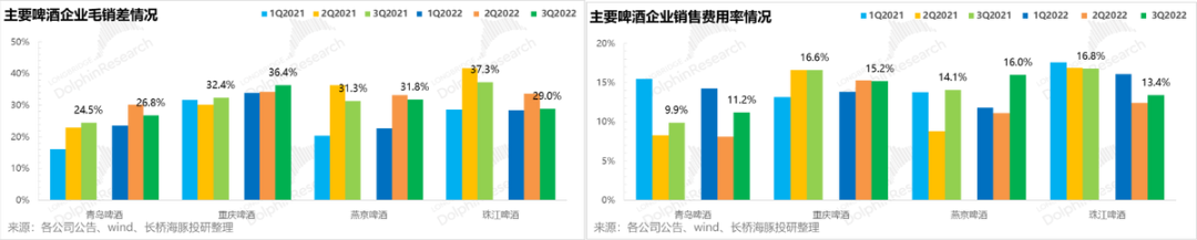 从这几家公司的情况来看,虽然三季度每家公司虽仍有吨价提升对毛利率的正面影响,但之前包材等原材料价格上行,近期下行之后各家公司都有采购周期的影响,他们三季度毛利率反而还是在变差状态(珠江啤酒受到会计准则变更影响,毛利率不作比较,其他A股公司已经调整过运费影响),除了燕京这种小体量公司之外,大龙头当中只有青啤的毛利率表现相对平稳,没有特别下滑。