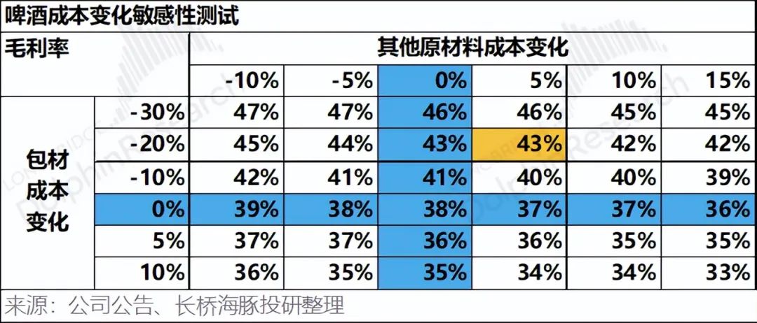 海豚君测算了包材成本下行带来的毛利率弹性:如果是完全市场化的采购,在去年到现在包材成本已经下降接近20%的情况下,毛利率理论的上行空间有希望从38%上行到43%左右,至少五个百分点的利润释放空间,考虑到实际上各家有采购周期和锁价控风险等情况,海豚君倾向于接下来的至少半年左右,成本下降至少能够提升啤酒公司大约2-3个百分点毛利率。