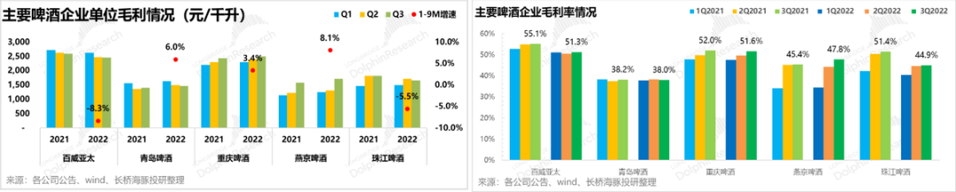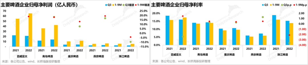 由于成本端前三季度还未看到明显回落,加上三季度疫情缓解之后价格品牌销售费用投入的影响,目前几家啤酒企业的归母净利率改善并不算特别明显。从结果上来看,百威亚太表现最差,青啤最好,重啤也算还行。